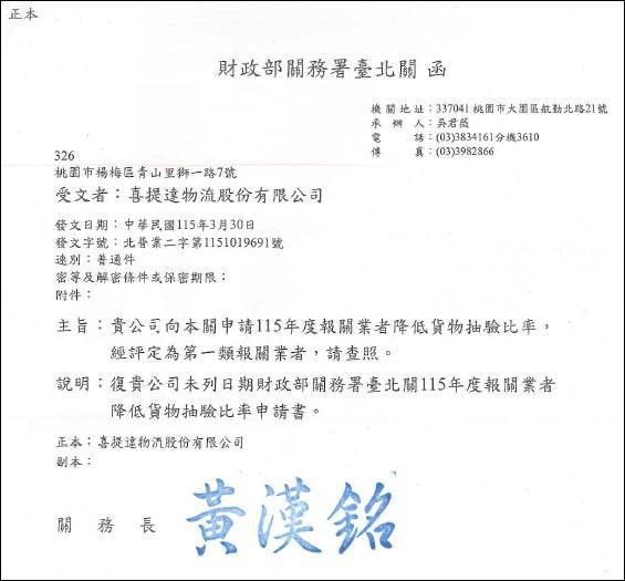 賀!喜提達榮獲臺北關「連續四年」評定為「第一類報關業者」!!